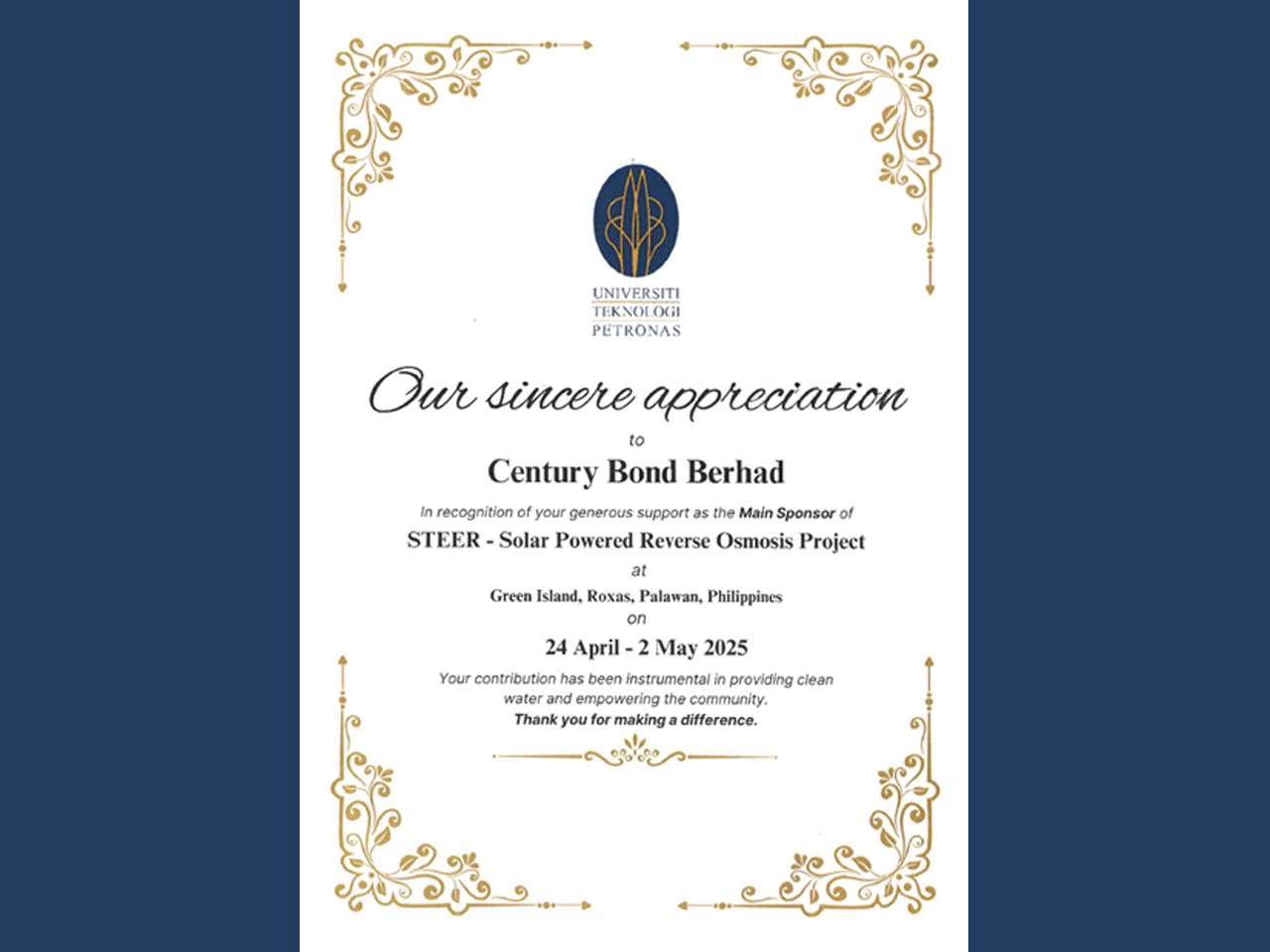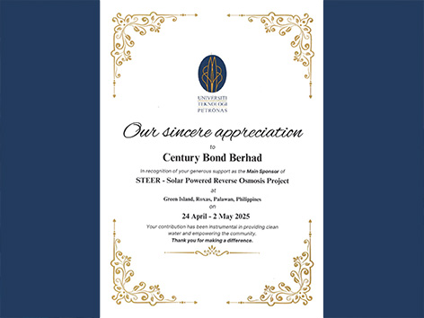 Century Bond Bhd are proud to support a Solar-Powered Reverse Osmosis Desalination Project initiated by students from Universiti Teknologi Petronas. This initiative aims to provide the community of Green Island, Palawan, Philippines with reliable access to clean and safe water through an affordable and environmentally sustainable solution.